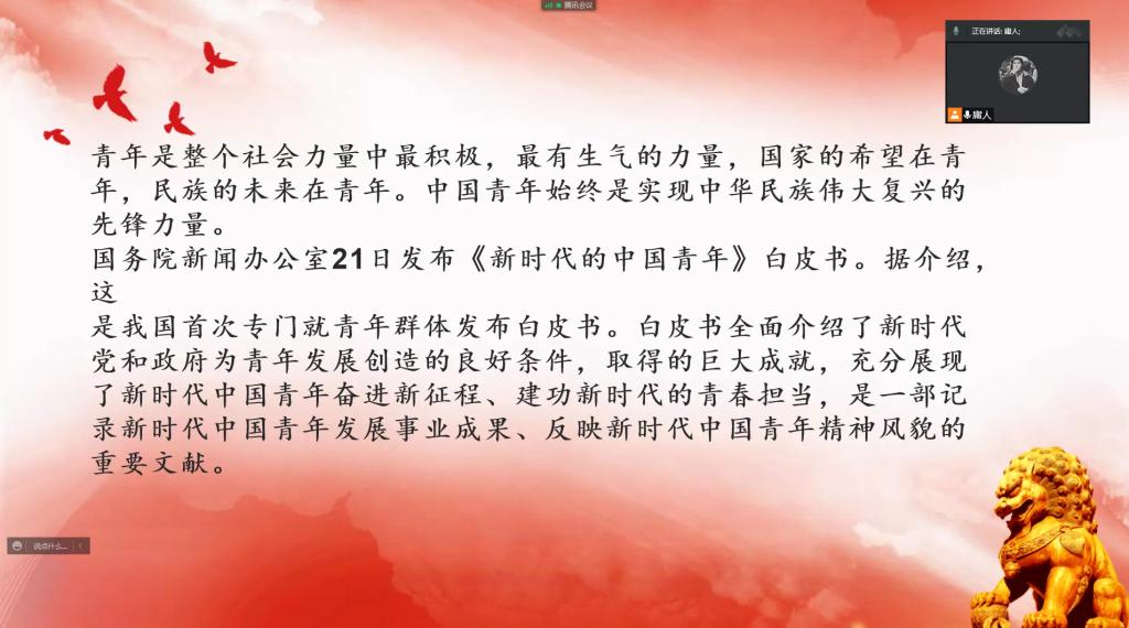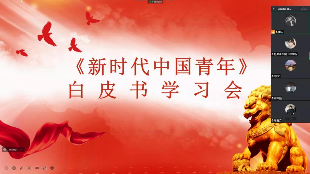 2022年4月21日,国务院新闻办公室发布《新时代的中国青年》白皮书,这是我国首次专门就青年群体发布的白皮书。为了让学生干部了解新时代中国青年发展事业成果和精神风貌,英国上市公司365于4月24日组织学习《新时代的中国青年》白皮书。