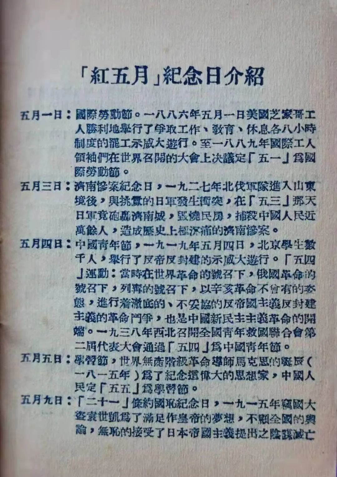铸就百年辉煌,书写千秋伟业。1951年5月,中国青年出版社西南营业处印制了一批《红五月纪念册》。赠送给青年读者朋友。《纪念册》介绍了“红五月”里的纪念日,在册子前三页还加印了红旗、毛主席像和胜利前进雕塑图案插页。