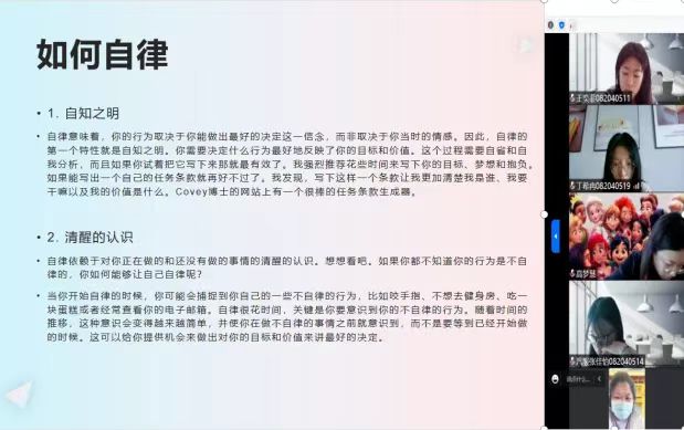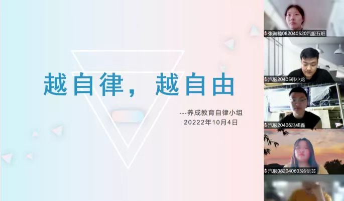 自律就是自我约束,自我管理,自我反省。自律能让我们克服惰性,抵制诱惑,学会战胜自己。如果学习是一条船,那么自律就是造船人;如果理想是遥远的海的彼岸,那么自律就是你的跨海大桥;如果自信是一棵树,那么自律就是泥土里坚硬牢固的根。约束也许会让我们感到不适,但绝对不能放任不管。我院养成教育自律小组的同学们于2022年10月4日在线上开展了“越自律,越自由”主题交流会。