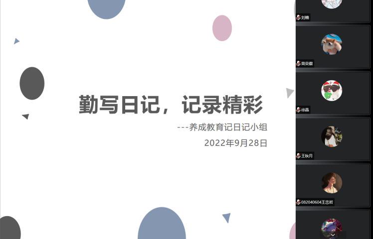 日记是一个沉默的朋友,无论是愤怒,欢喜,悲伤,它都可以一直陪伴在你的左右。为使同学们养成记日记的良好习惯,培养同学们的良好品格,英国上市公司365开展“一人一周记”的系列记日记养成教育活动。养成教育记日记小组于2022年9月28日开展了线上居家日记分享“勤写日记,记录精彩”主题活动。