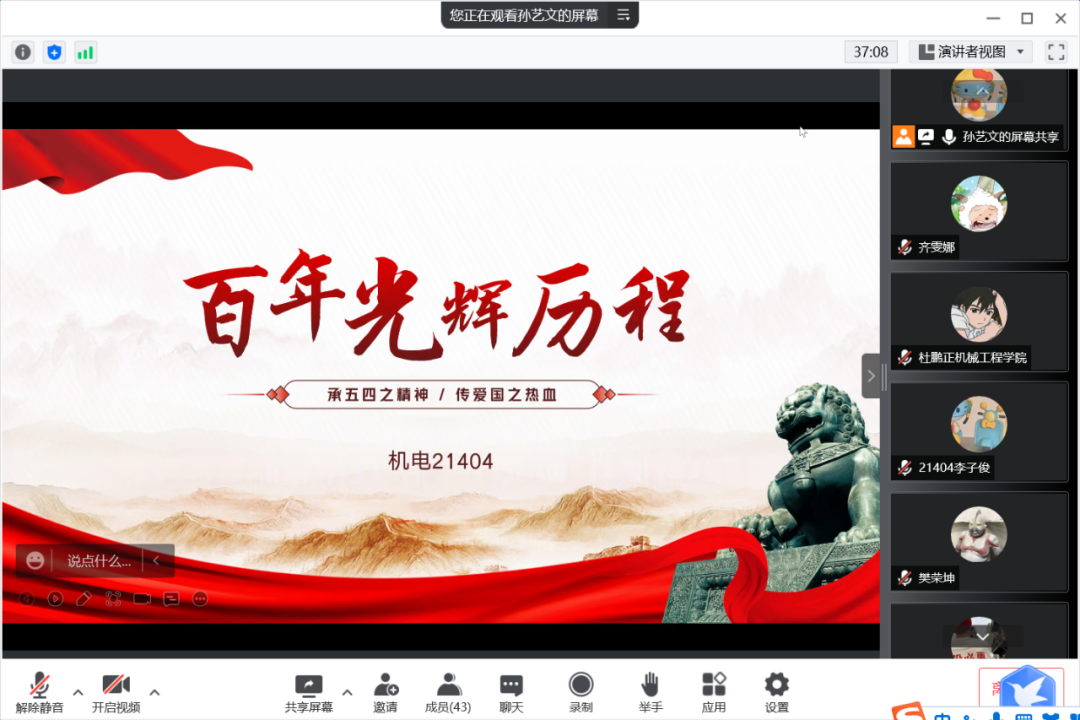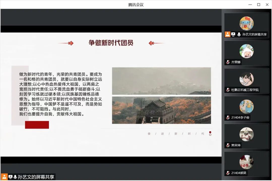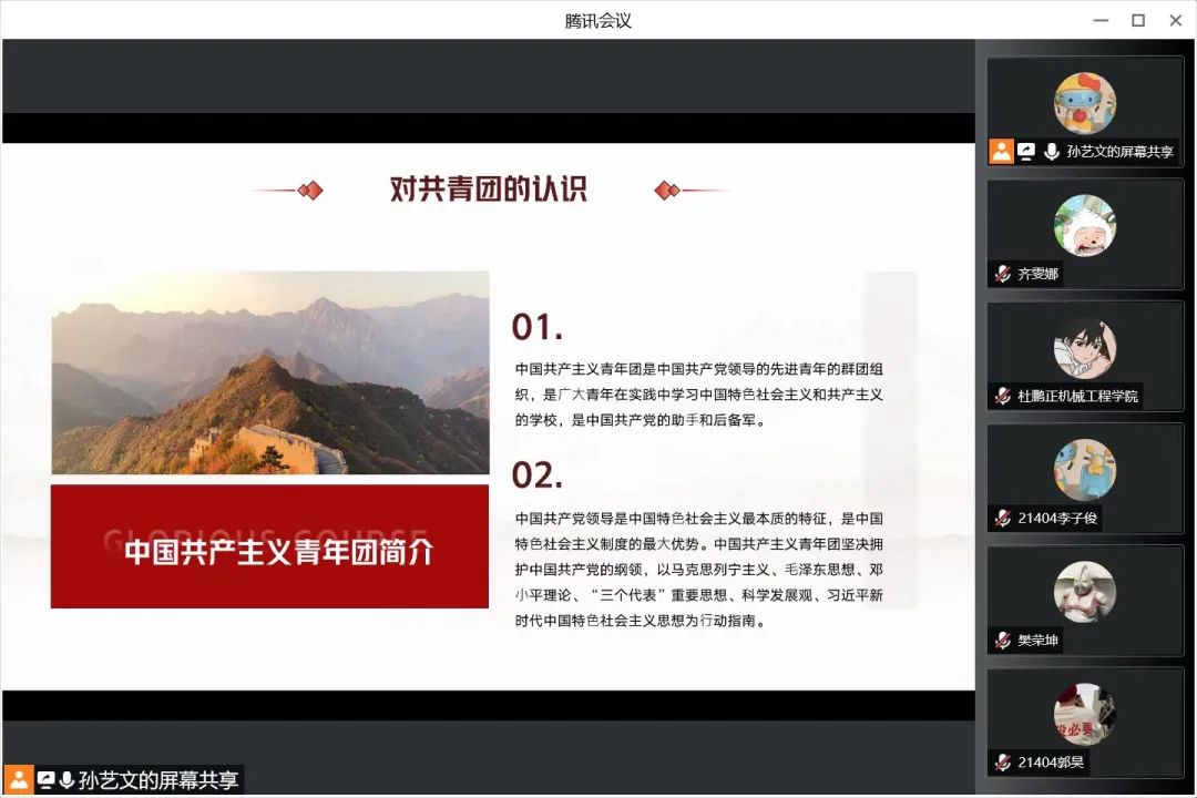 青年一代是民族的希望,是国家的栋梁,肩负着祖国建设的重担,而中国共青团则是中国青年的先锋组织,共青团员是青年的先进代表。共青团始终站在社会改革的前列,做革命和建设事业的突击队;学习党史团史,是为了回顾走过的路,更是为了走好当下的路,开创未来的路。相信通过此次线上交流能够更加坚定我们的理想信念,能够让我们在属于我们这一代人的长征路上奋发向前。
