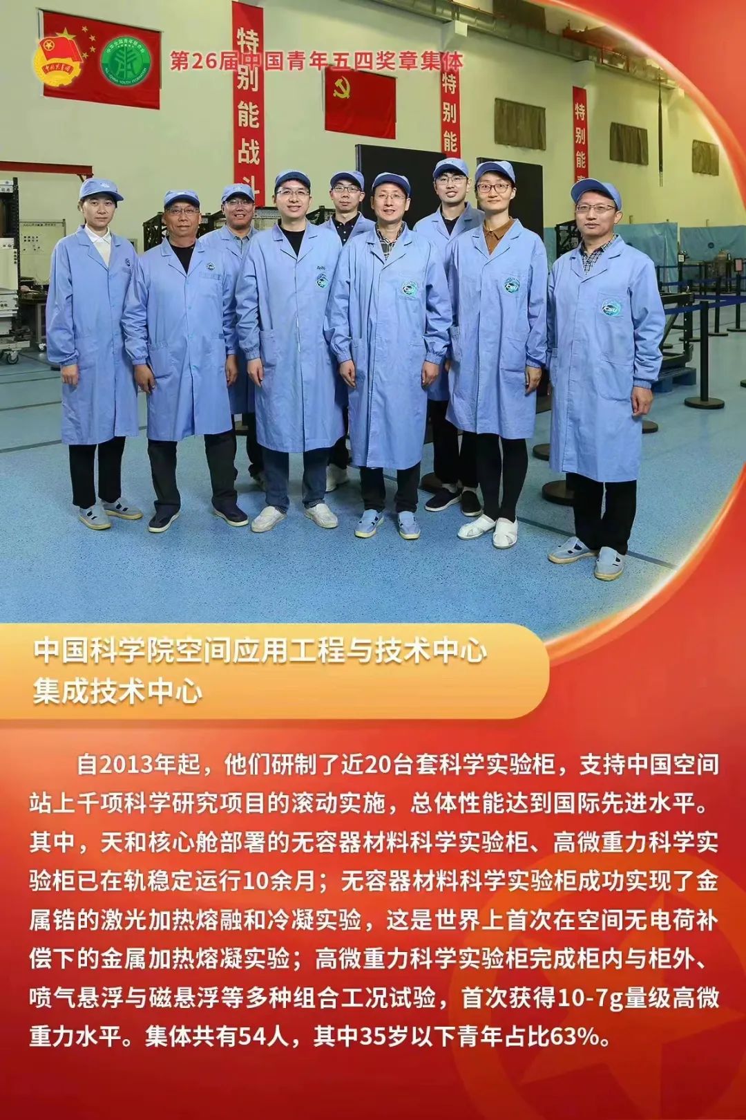 中国科学院空间应用工程与技术中心集成技术中心自2013年起,研制了近20台套科学实验柜,支持中国空间站上千项科学研究项目的滚动实施,总体性能达到国际先进水平,其中,天和核心舱部署的无容器材料科学实验柜、高微重力科学实验柜已在稳定运行10余月;实现了世界上首次在空间无电荷补偿下的金属加热熔凝实验。向青年先锋集体致敬!