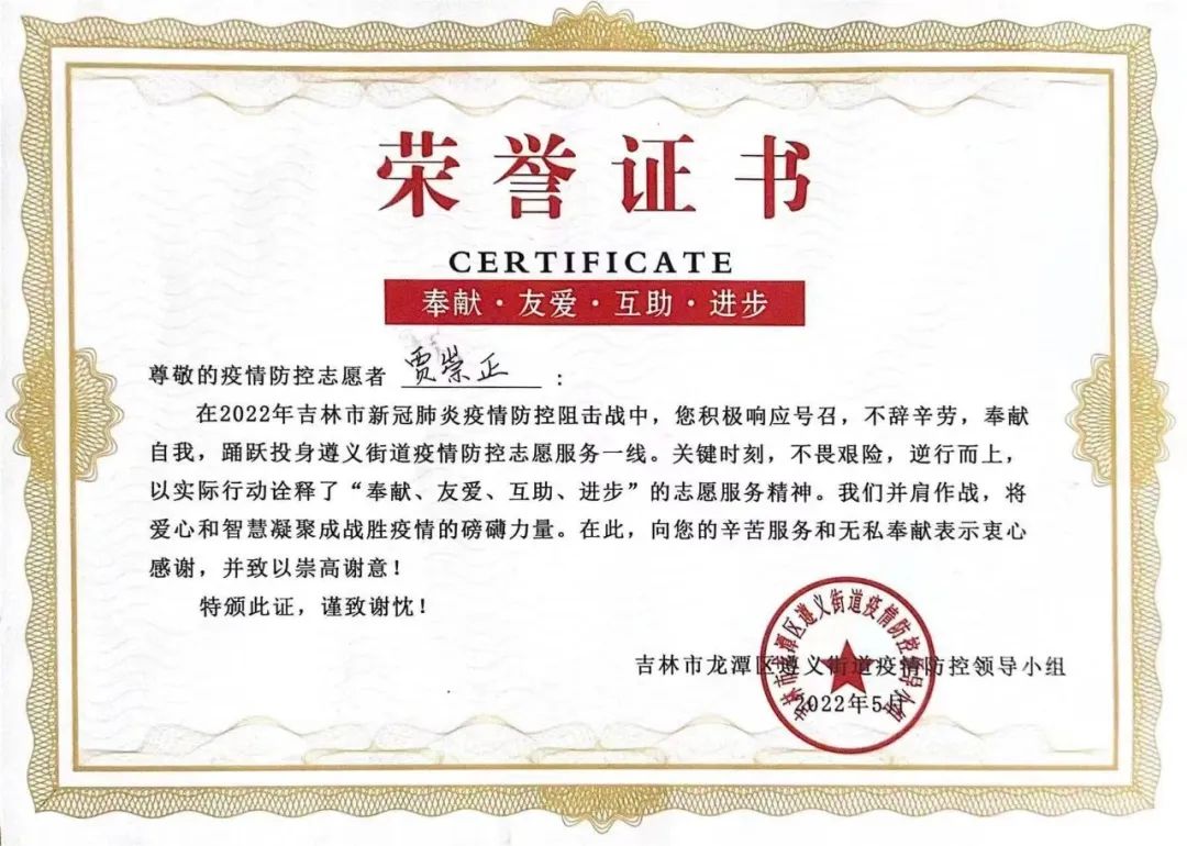 街道是疫情防控的最后一道防线,也是落实联防联控、群防群控的关键。贾崇正同学接到工作分配后,在小区门口与工作人员一起执勤,对来往人员、车辆,进行体温测量和信息登记、维持秩序、运送物资、走访劝导、采集信息,在确保自身安全的前提下,履职尽责坚守自己的岗位,配合街道工作人员进行防疫知识宣传,还获得的了街道颁发的荣誉证书。