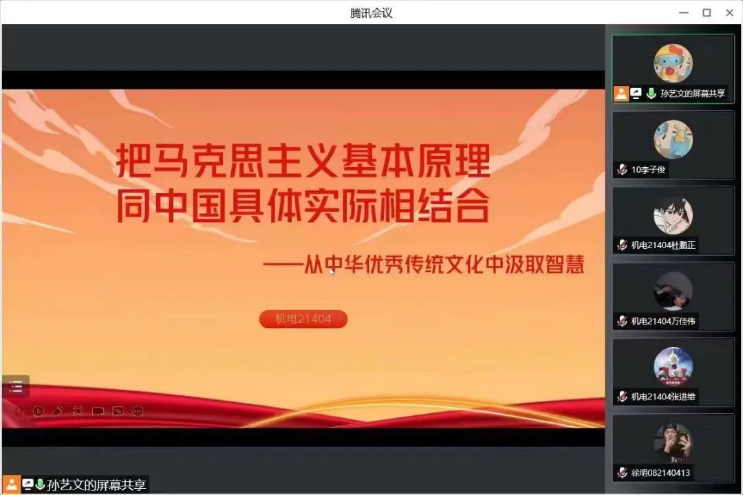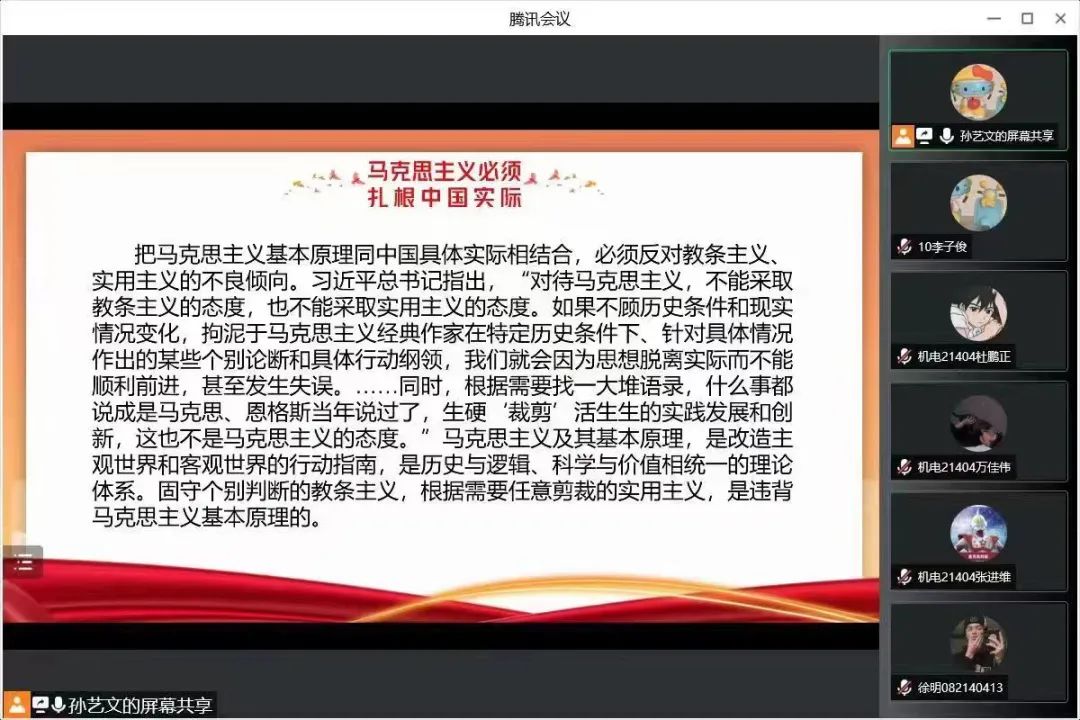 为把马克思主义基本原理同中国具体实际相结合、同中华优秀传统文化相结合,深入学习领会习近平新时代中国特色社会主义思想,机电21404班学习课堂于2022年6月30日组织同学们在线上开展“把马克思主义基本原理,同中国具体实际相结合”主题教育活动第二期。
