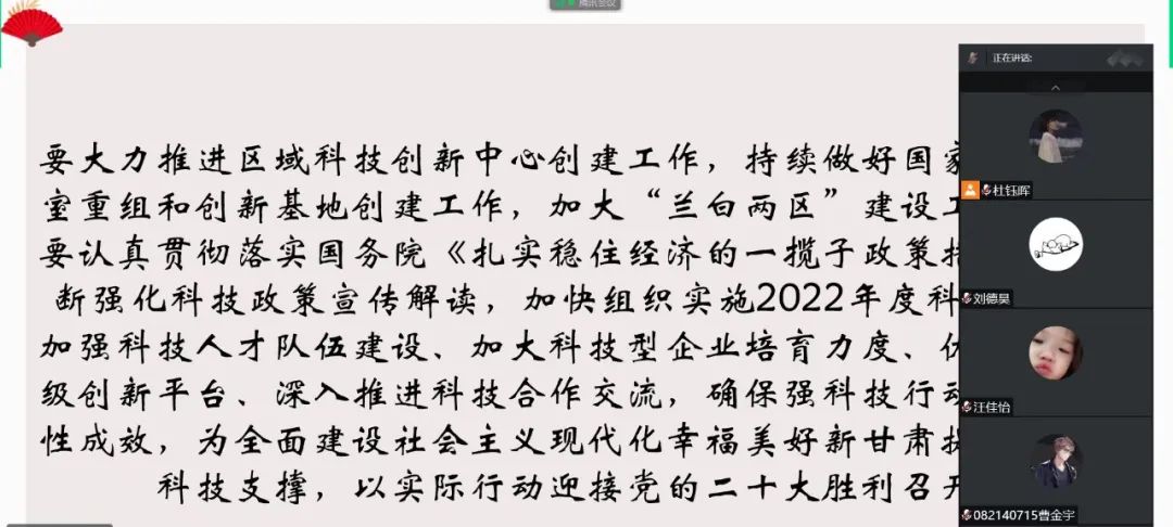 省第十四次党代会胜利召开,绘就了甘肃发展的宏伟蓝图,吹响了接续奋斗的前进号角。会议要求,厅系统各级党组织要充分发挥党组理论学习中心组成员示范引领作用,带动广大党员干部广泛深入学习贯彻会议精神,不断增强贯彻落实会议精神的政治、思想和行动自觉。要大力推进区域科技创新中心创建工作,加大科技型企业培育力度、优化整合省级创新平台、为全面建设社会主义现代化幸福美好新甘肃提供有力的科技支撑。