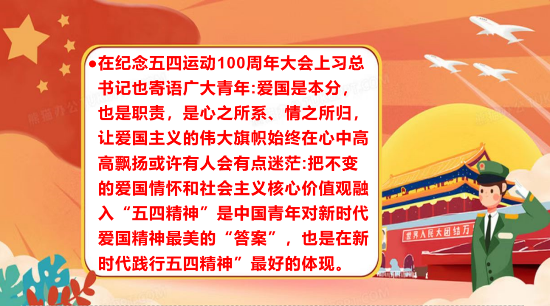 活动伊始,主持人向同学们介绍:在进入中国特色社会主义新时代的今天,青年已成为国家振兴、民族崛起的最重要力量之一。把不变的爱国情怀和社会主义核心价值观融入“五四精神”是中国青年对新时代爱国精神最美的“答案”,也是在新时代践行“五四精神”最好的体现。