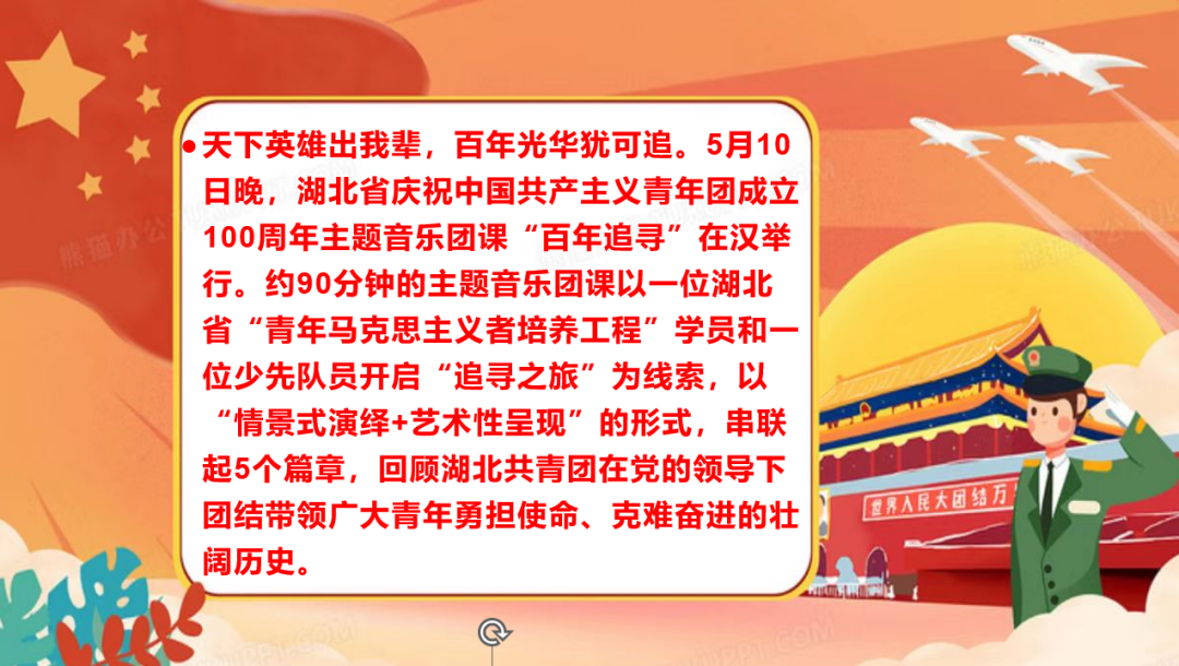 天下英雄出我辈,百年光华犹可追。为了回顾共青团在党的领导下团结带领广大青年勇担使命、克难奋进的壮阔历史。大一全体学生学习课堂于2022年7月10日下午4点在线上开展“百年追寻”主题音乐团课活动。