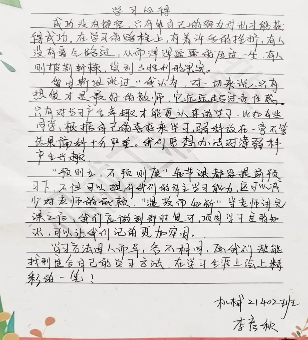 同学表示“成功没有捷径只有靠自己的努力付出才能获得成功。在学习的路程上,有着许多的挫折,有人没有勇气路过,从而浑浑噩噩的度过一生,有人则披荆斩棘尝到了胜利的果实。”