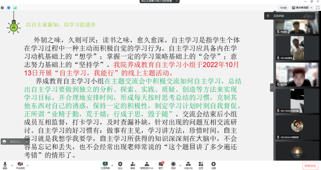 为加强各部门之间的交流,推进后期工作的顺利开展。我院志愿者协会于2022年10月21日20:30在线上召开了本学期第一次例会,本次会议志愿者协会全体成员参加。
