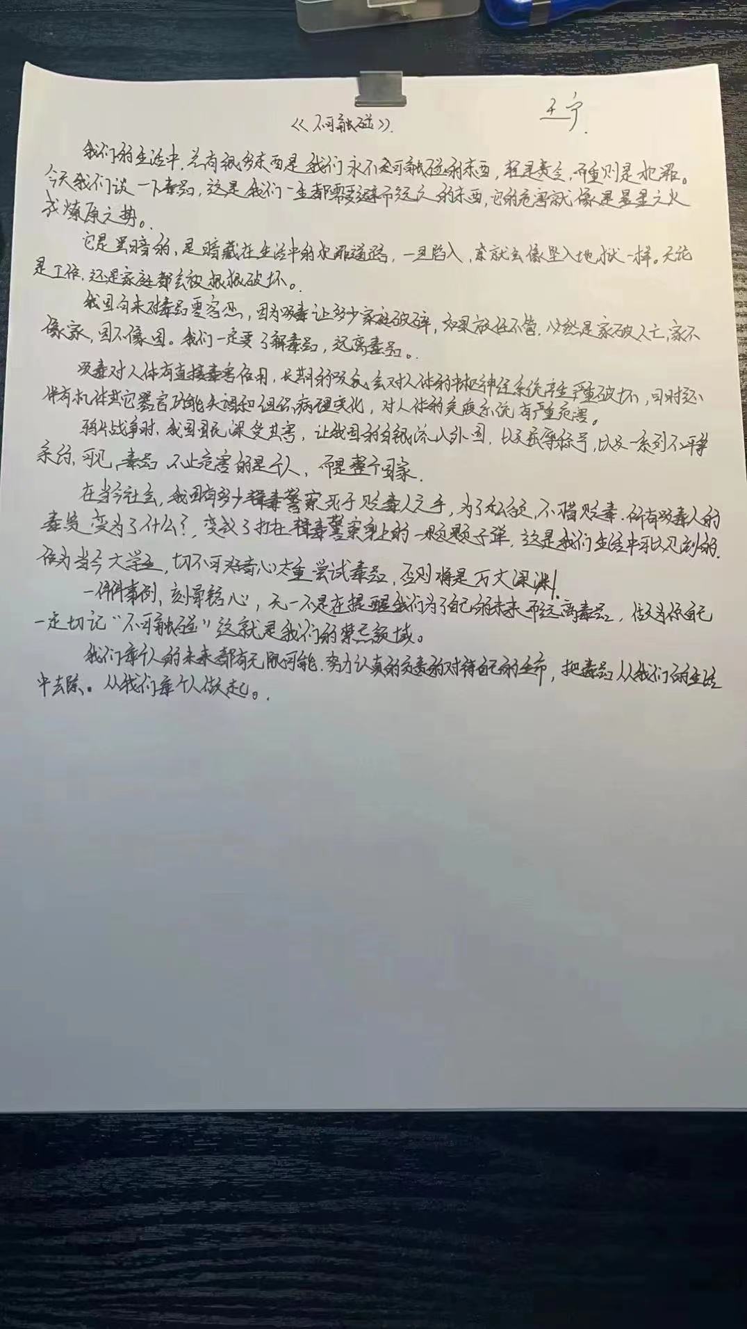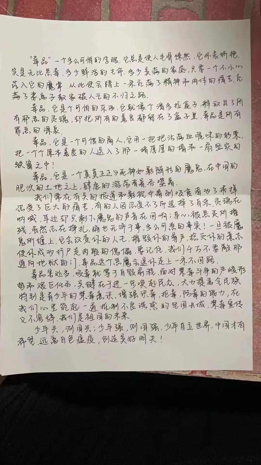 此次活动同学们积极参与,在征文中表示自己要远离毒品,珍爱生命。在征文中,广大学生们近距离的了解到了毒品的相关知识、认清毒品危害,消除了在毒品认识上的误区,让“远离毒品、走健康人生路”观念深入人心,同时也在一定程度上提高了师生对毒品的防范能力,达到了预期效果,为构建平安校园夯实了坚实的基础。增强防毒、拒毒的意识和能力,预防和减少涉毒违法犯罪。