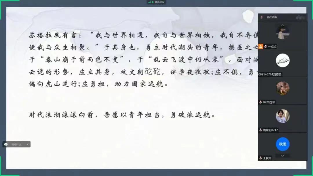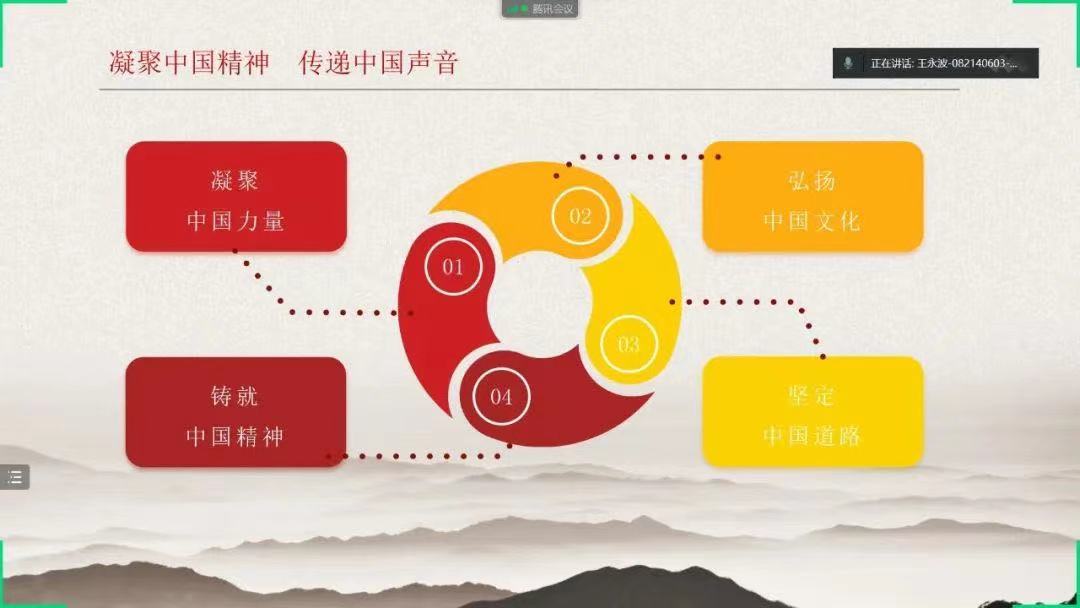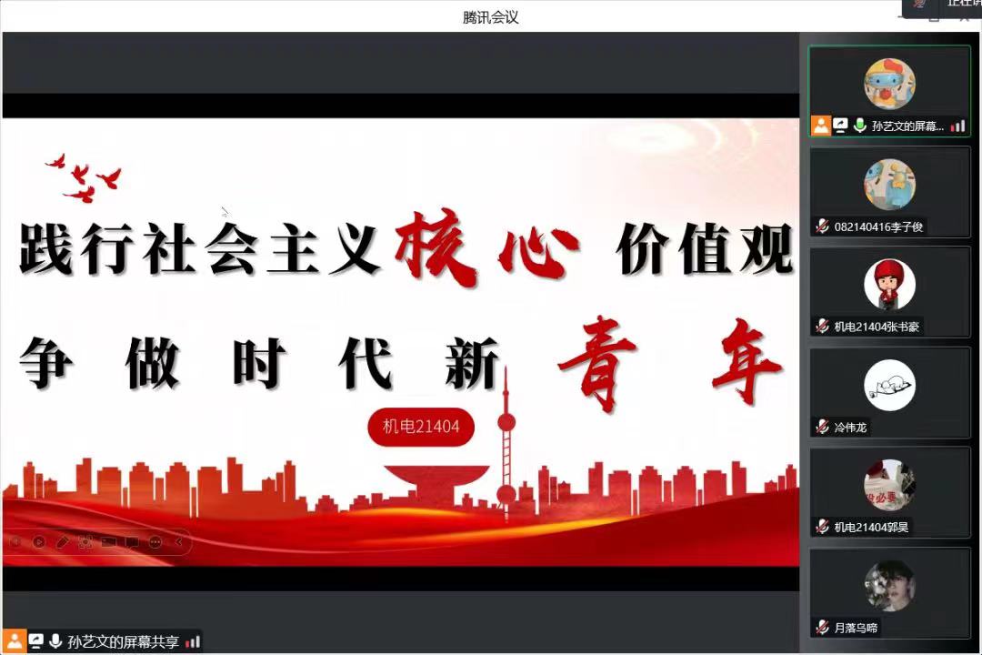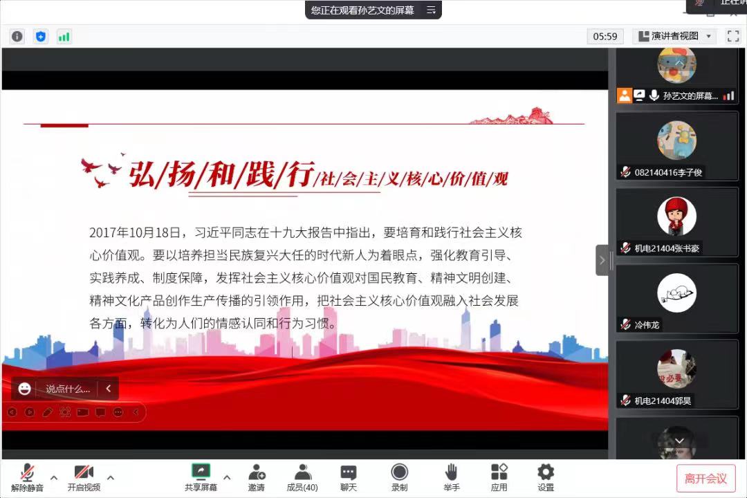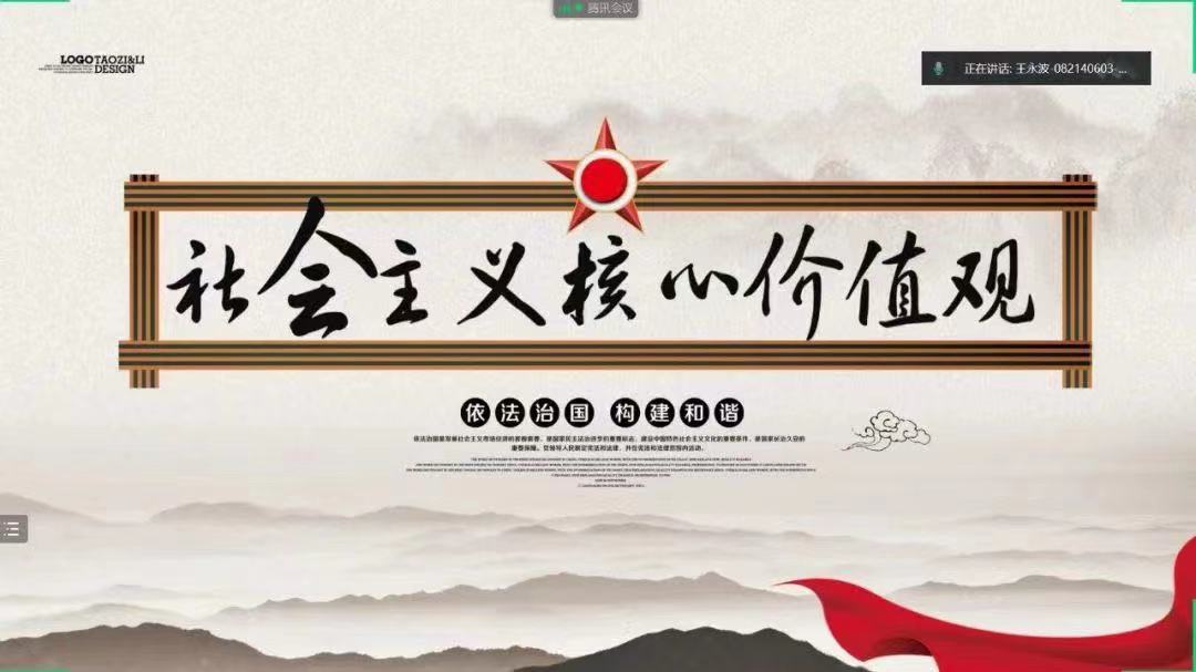 活动以线上会议的形式举行。我们主要围绕社会主义核心价值观体系,大力弘扬了“爱国、敬业、诚信、友善”的道德规范,积极宣传“自由、平等、公正、法治”的社会价值,自觉追求“富强、民主、文明、和谐”的国家理想。我们立足于诚信友善,倡导立德修身;或着眼于爱国敬业,践行自强不息精神;或致力于文明和谐,大力构建文明校园;或者倾心于富强民主,努力实现中国梦。