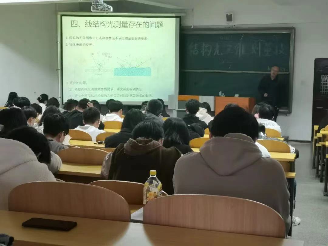 整个报告大体分为四部分,依次为“结构光三维测量的原理”、“线结构光测量数据—光条中心点检测”、“线结构光测量的应用研究”、“线结构光测量存在的问题”。谭庆昌院长建议同学们一定要注重实践实验,因为实践才是我们检验真理的唯一标准。在谭庆昌院长声情并茂的讲解下,同学们也收获颇多,同时也提出了自己听讲时候的疑惑与不解,谭庆昌院长对疑难点作出了解答并与同学们热切讨论,同学们均表示受益匪浅。