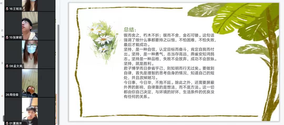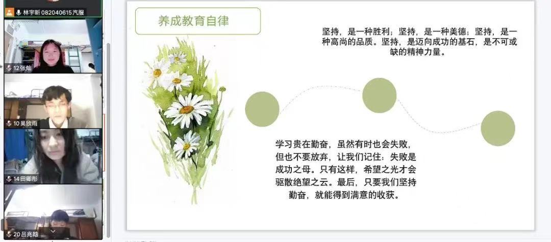 活动伊始,负责人表述了此次活动的主要内容以及活动的意义并鼓励同学们在疫情期间更应该要自律认真起来,将好习惯和日常学习生活相结合,我们通过APP进行英语打卡活动,这样不仅充实了自己的日常生活,还能够为自己将来的英语考级做准备,培养同学们认真做事情的好习惯。小组成员积极参与,踊跃分享,热烈的讨论在单词背诵上的技巧。负责人总结到:“认真代表着自己有着强大的信念,新一代大学生更要如此,在疫情的非常时期内更应该认真对待每一件事,希望全体成员们能够每天认真打卡记录,充实自己。”
