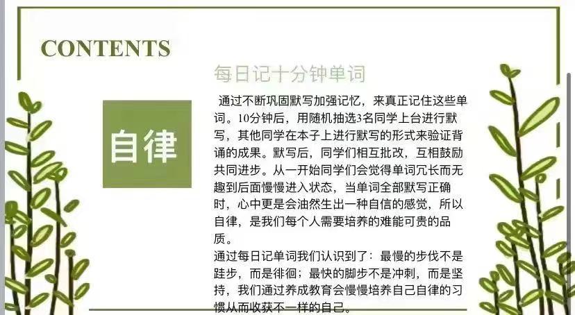 通过本次课前十分钟活动,使同学们加深了对自律的认知,并让同学们对自己的未来有了清晰的方向,还增加了同学们学习的动力。同时使同学们认识到,最慢的步伐不是跬步,而是徘徊;最快的脚步不是冲刺,而是坚持;希望同学们通过养成教育慢慢培养自己自律的学习习惯从而收获不一样的自己。
