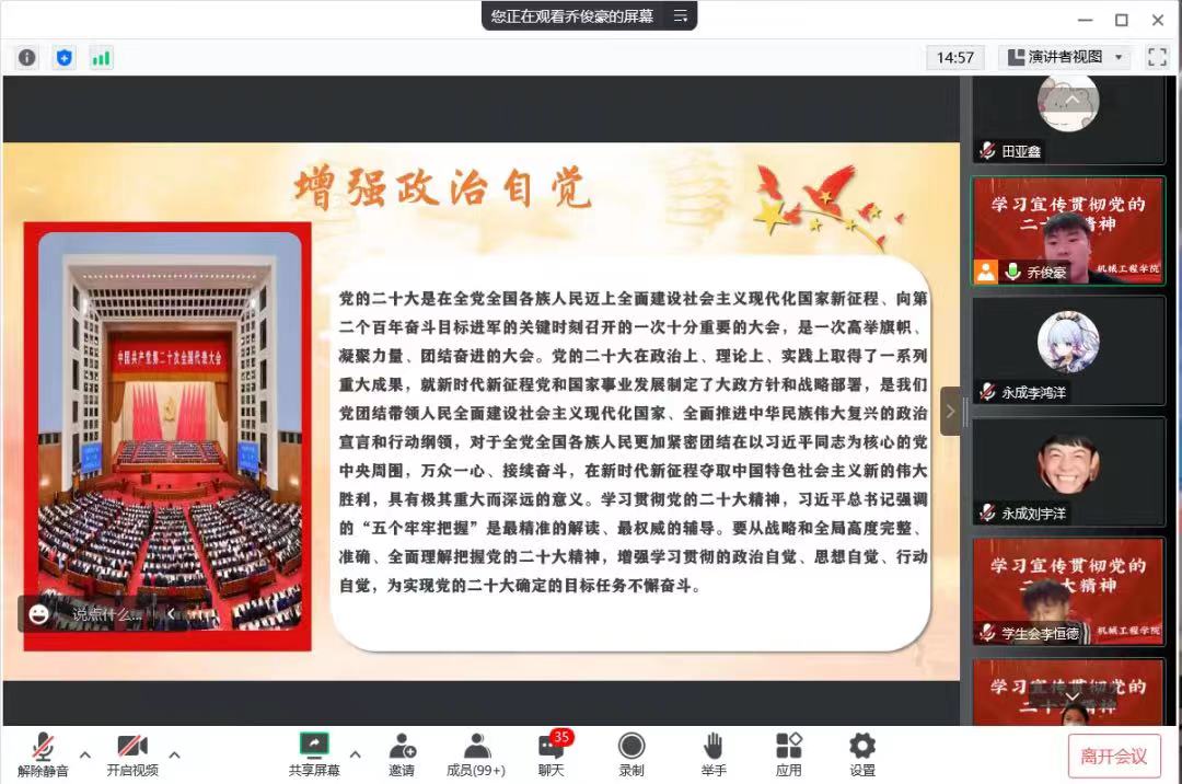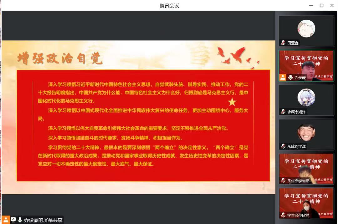 为深入学习宣传贯彻党的二十大精神,深刻领会和准确把握党的二十大提出的新思想新论断,英国上市公司365于2022年11月26号开展线上二十大宣讲会暨四立学堂开班仪式,全体学生干部参加,主讲人为乔俊豪老师。
