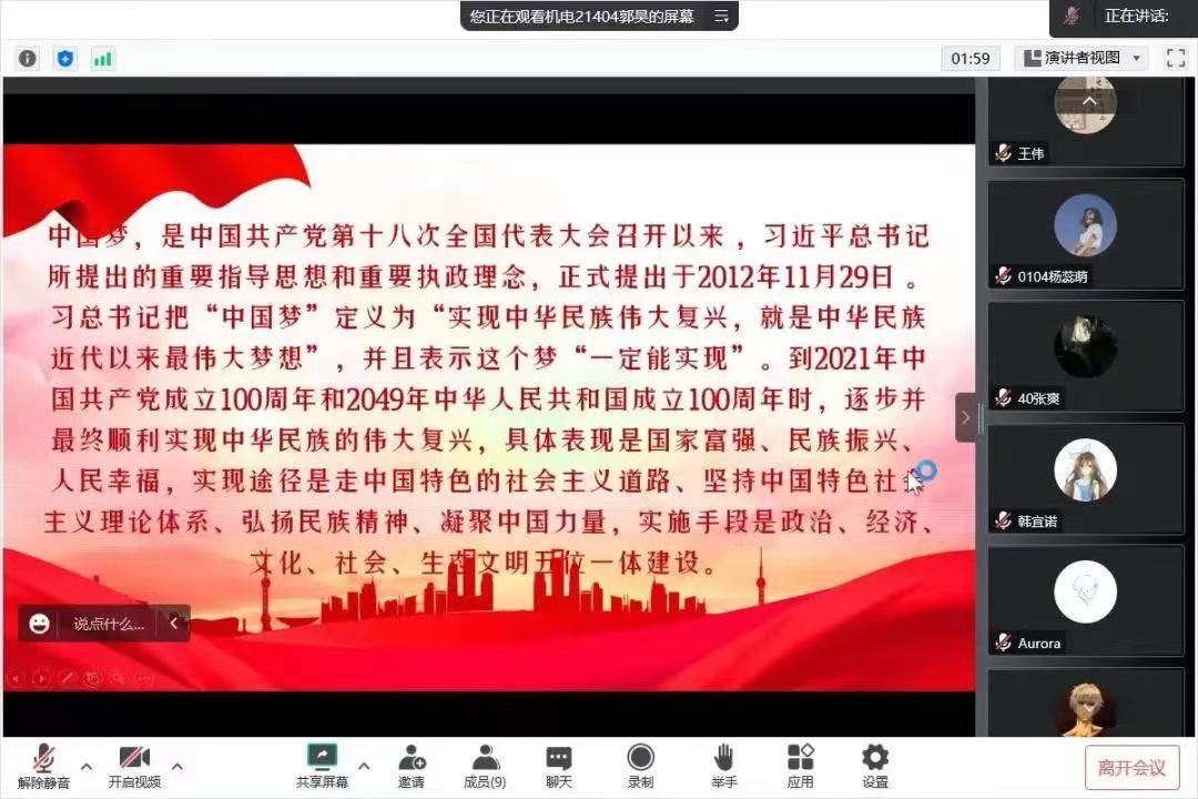 在活动中同学们强调中国梦是民族的梦,也是每个中国人的梦。只要我们紧密团结,万众一心,为实现共同梦想而奋斗,实现梦想的力量就无比强大,我们每个人为实现自己梦想的努力就拥有的广阔空间。身为机械学子的我们一定要坚持不忘初心、牢记使命,奋发有为,精诚团结、勤勉工作,赤诚奉献。在做好本职工作的同时,埋头苦干,从自己做起,我们要不怕困难,攻坚克难,经受锻炼,增长才干。做一名合格的追梦人。在逐梦途中,青年首先应该加强自我道德建设,以自身为本,注重内在。大会最后,在各位同学饱含热情的发言下渐渐迎来了尾声。