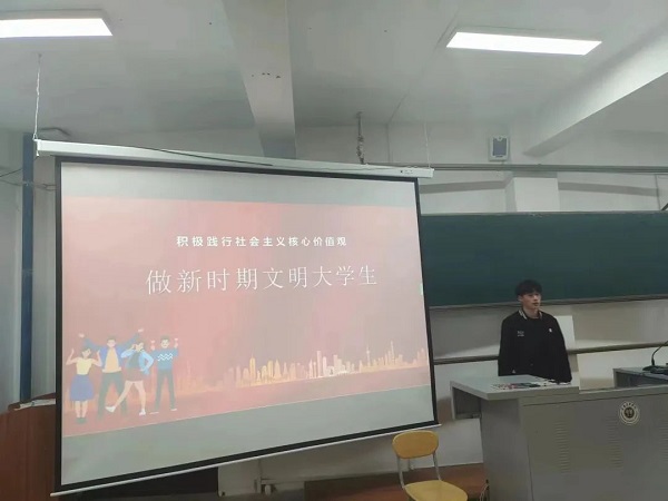 在此次活动中,首先由学生代表向大家进行开篇演讲,在本次的演讲中充分提到了做文明大学生的具体要求:在语言上讲文明、行为上讲规范、生活中讲卫生、活动中讲参与、集体中讲团结、待人上讲礼貌、处事上讲谦让、时时处处讲安全。其次向同学们介绍了社会主义核心价值观的内涵,从国家、社会、个人层面进行讲解,而且与源远流长的中华传统文化与传统美德有着密不可分的关系,倡导同学们谨记社会主义核心价值观的内涵。最后全体成员共同宣读了社会主义核心价值观的内容,并要不断的弘扬社会主义核心价值观,坚定爱国主义,让社会主义核心价值观的氛围在校园中无处不在,让它在每个人的心中根深蒂固。
