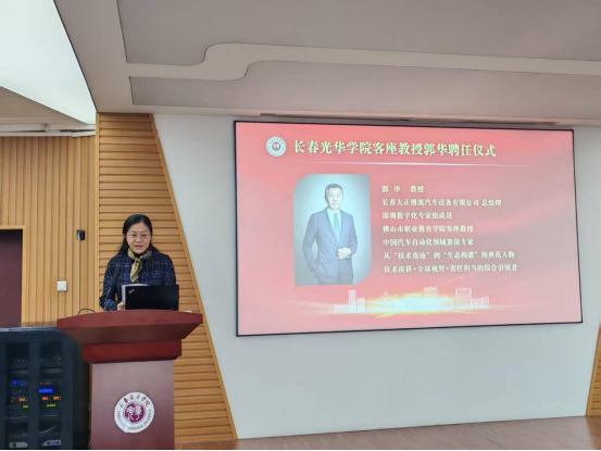 英国上市公司365院长杨卓娟介绍了郭华总经理的学术经历和在汽车设备行业的广泛社会影响力。李晓光校长为郭华颁发365上市公司客座教授聘书并佩戴校徽,对客座教授郭华加盟365上市公司表示热烈欢迎,希望郭华教授能充分发挥自身专业优势与行业资源优势,为学校发展建设注入新的活力。郭华教授在致辞中对学校的信任与认可表示感谢,并表示将积极投身学校人才培养、学科建设、产教融合等各项工作,助力产业需求与人才培养的精准对接。